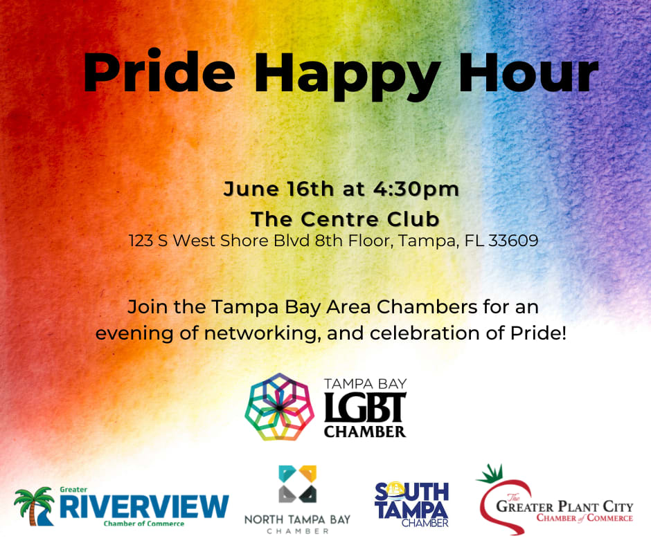 Join the Tampa Bay Area Chambers for an evening of networking, and celebration of Pride with local businesses professionals at the Centre Club of Tampa! In partnership with the North Tampa Chamber, South Tampa Chamber, Tampa Bay LGBT Chamber, Plant City Chamber, & Riverview Chamber. This event is sponsored by the Centre Club of Tampa.
