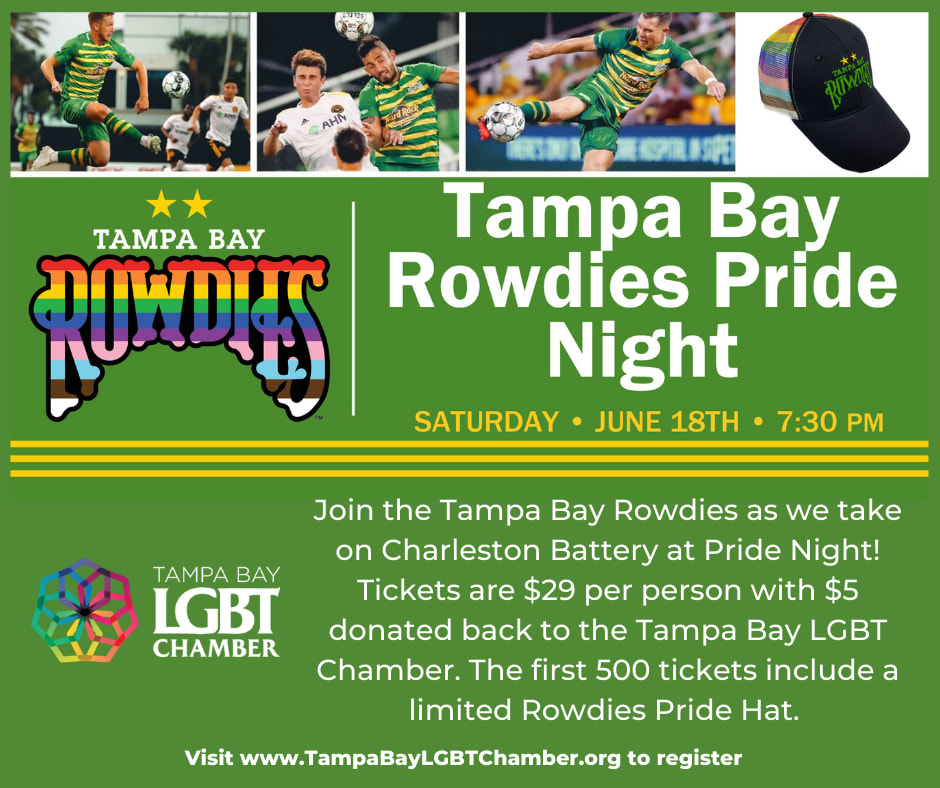 Join the Tampa Bay Rowdies as we take on Charleston Battery on Saturday June 18th at 7:30pm. Tickets are $29 per person with $5 donated back to the Tampa Bay LGBT Chamber. The first 500 tickets include a limited Rowdies Pride Hat. Use the following link or QR code below to secure your tickets, https://fevo.me/tbrlgbtchamber