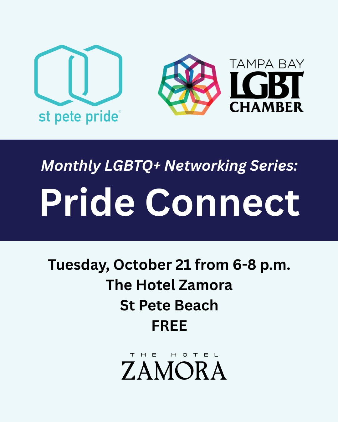 Celebrate love & pride at Slay the Sunset, Hotel Zamora’s first Rooftop PRIDE Pop-Up with the chamber and St Pete PRIDE—wine, valet & vibes included. We are excited to partner with St Pete PRIDE as part of our Pride Connect to bring you a new series of networking events.