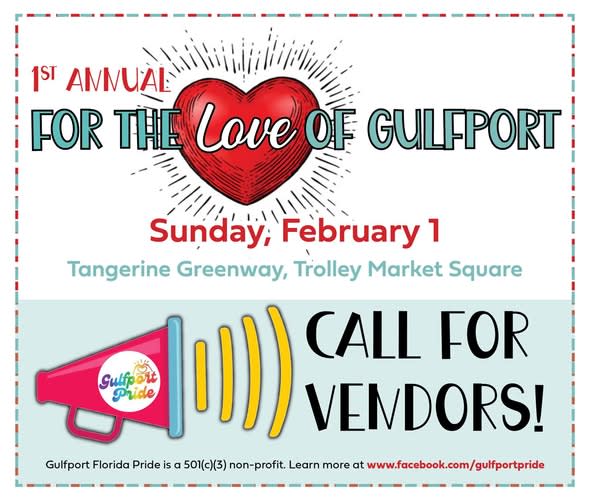 Call For Vendors!! We are reaching out to all LGBTQ+ Small Business Owners, Vendors, Artists, Crafters, Entertainers, Food Vendors, Sponsors and their Allies for the First Annual For The Love of Gulfport Community Day hosted by Gulfport Florida PRIDE on Sunday, February 1st from 11am-4pm. Click the link below to apply for a booth space. Space is limited so apply now. Deadline to register is December 12th.